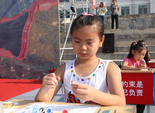 (石拐区第一中学小学部的学生现场制作书画展示)